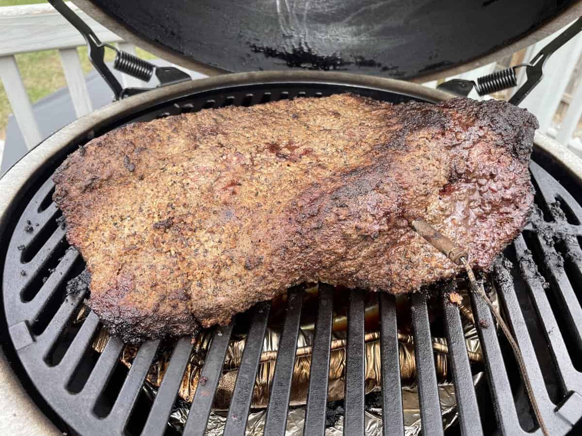 Nevertheless, it became obvious to me during the first two hours that my Large Big Green Egg ceramic cooker smokes the brisket faster than Franklin’s offset Pit Boss grill if both temperature settings are identical.