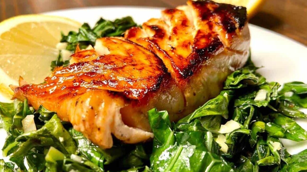 Honey Glazed Salmon cooks in a pan with garlic, lemon, and a light honey glaze. The salmon turns flaky while the sauce thickens slightly in the pan. Collard greens cook alongside the fish, which helps turn it into a full meal. Because the recipe moves quickly, it fits nicely into a list of 30-minute one-pan dinners.