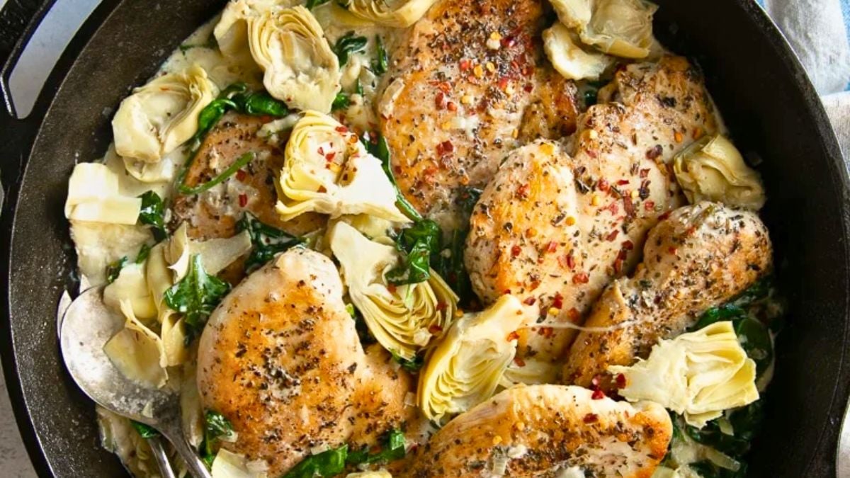 Spinach Artichoke Chicken cooks in a skillet with a creamy sauce, tender chicken, and plenty of spinach. The artichoke hearts bring extra texture that blends nicely with the sauce. Everything cooks in one pan, so cleanup stays simple. It is a reliable choice for 30-minute one-pan dinners when time feels tight.