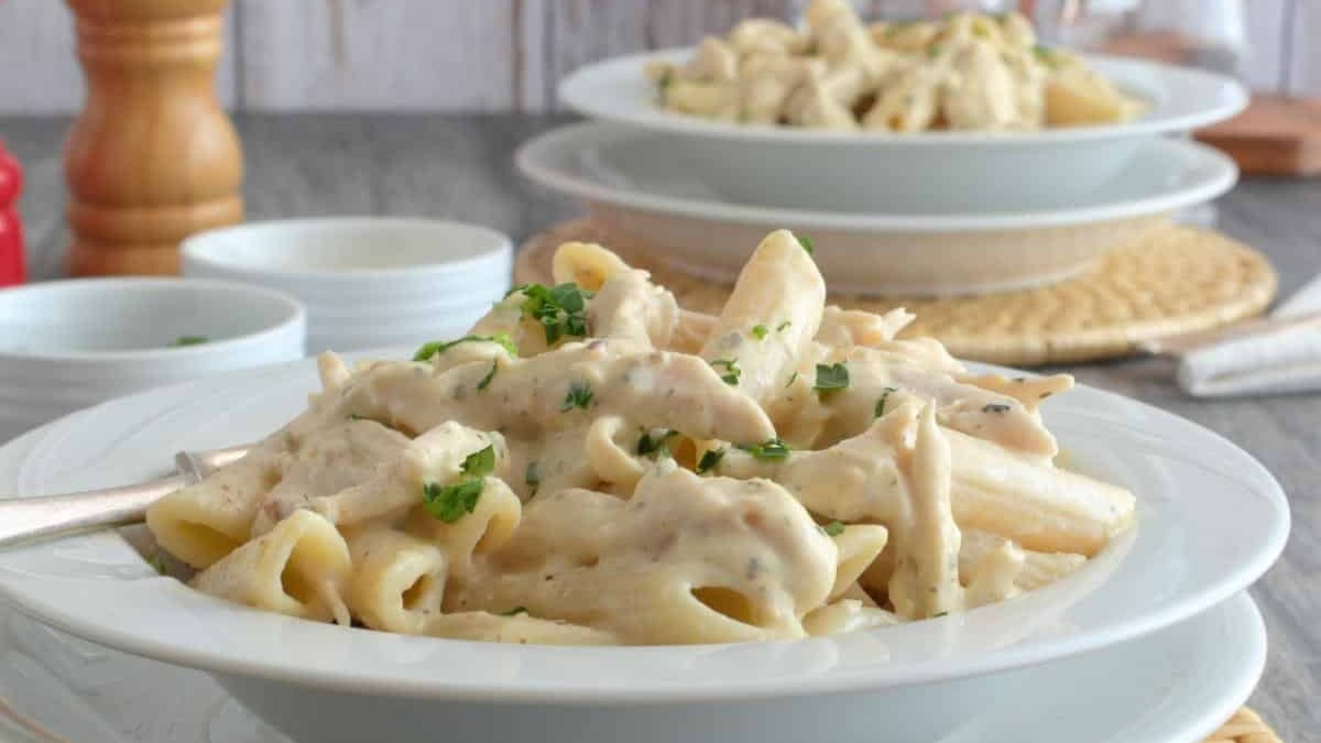 This dish cooks gently until the sauce turns thick and coats the pasta evenly. Meanwhile, garlic and parmesan blend smoothly without overpowering the chicken. Because timing stays flexible, dinner planning feels less rushed.