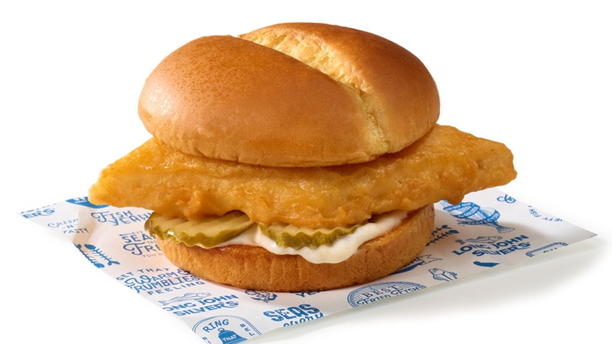 Long John Silver’s Fish Sandwich surprises by using a whole filet of Alaskan pollock rather than processed fish. The fish is battered and fried to a golden crisp, then paired with tartar sauce and pickles on a soft roll. The contrast between flaky fish and crunchy coating makes each bite satisfying. It stands out among fast‑food fish options for its quality and simplicity. When you’re craving seafood on the go, this sandwich delivers.