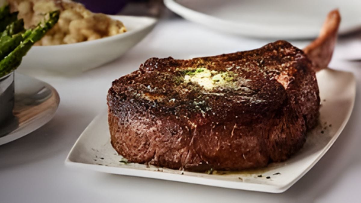 At Ruth’s Chris, the tomahawk ribeye isn’t just dinner — it’s an event. This 40-ounce beauty arrives sizzling, with a bone so long it looks like a handle from a medieval feast. The secret is in the cut: at least five inches of rib bone left intact for dramatic flair and flavor. “Frenching” the bone (trimming it clean) gives the steak that signature elegance you see in food photos. It’s big enough to share — but don’t feel bad if you don’t.