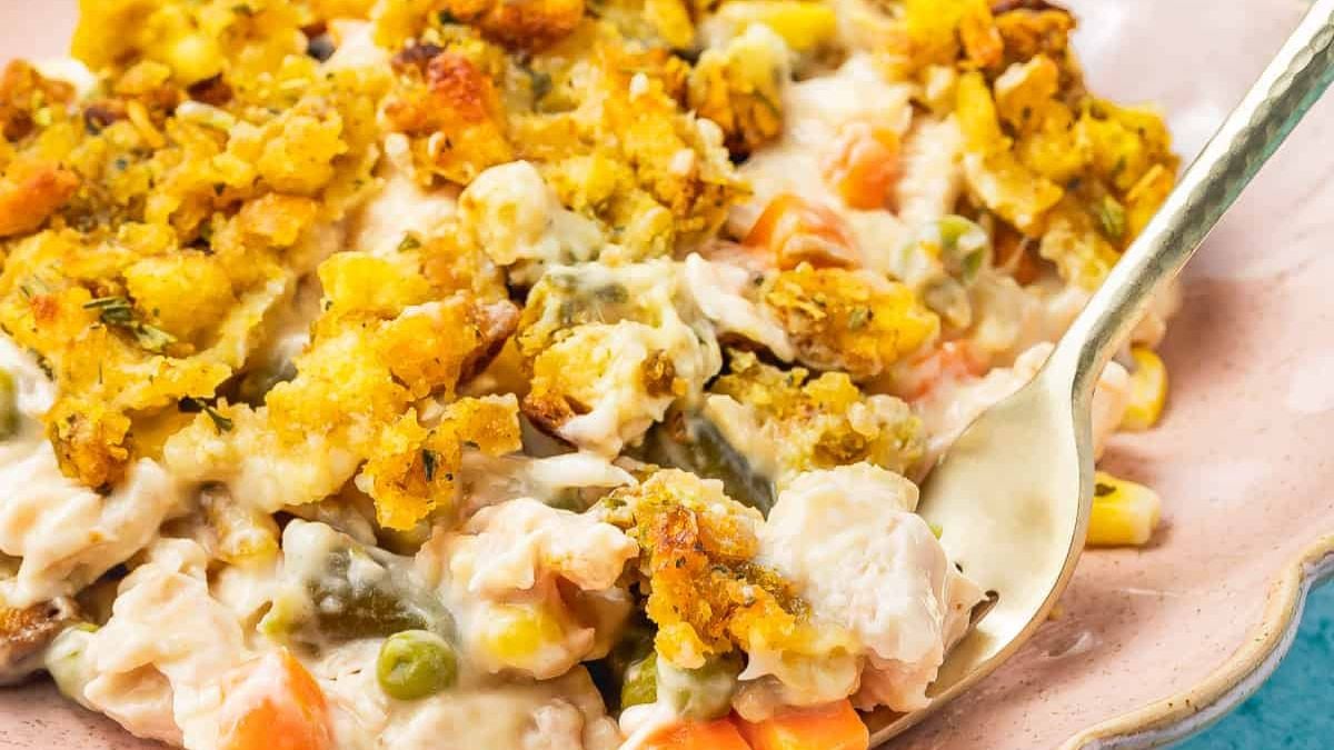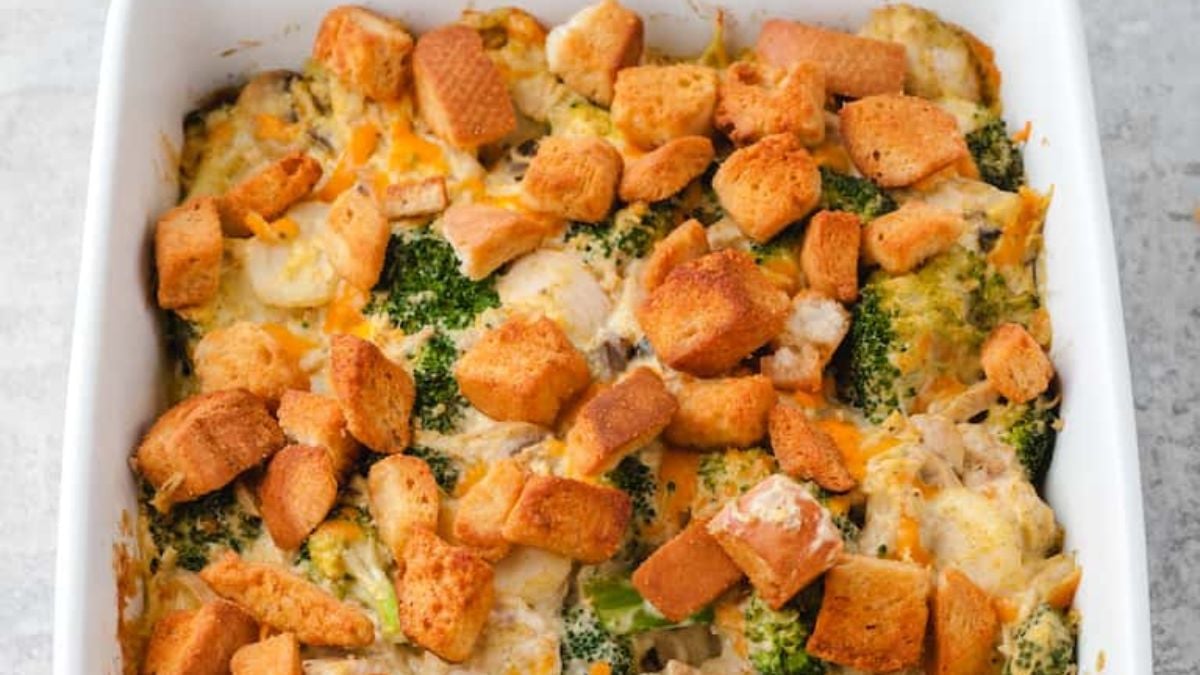 This casserole tucks creamy chicken under a crisp stuffing layer. The top stays firm while the filling stays smooth underneath. Everything bakes evenly without extra steps. It’s a solid option for family dinners.