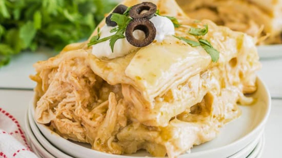 This enchilada casserole layers tortillas, chicken, and sauce in one pan. Since the chicken starts cooked, prep stays quick. The cheese melts through every layer as it bakes. It works great on nights when time runs short.