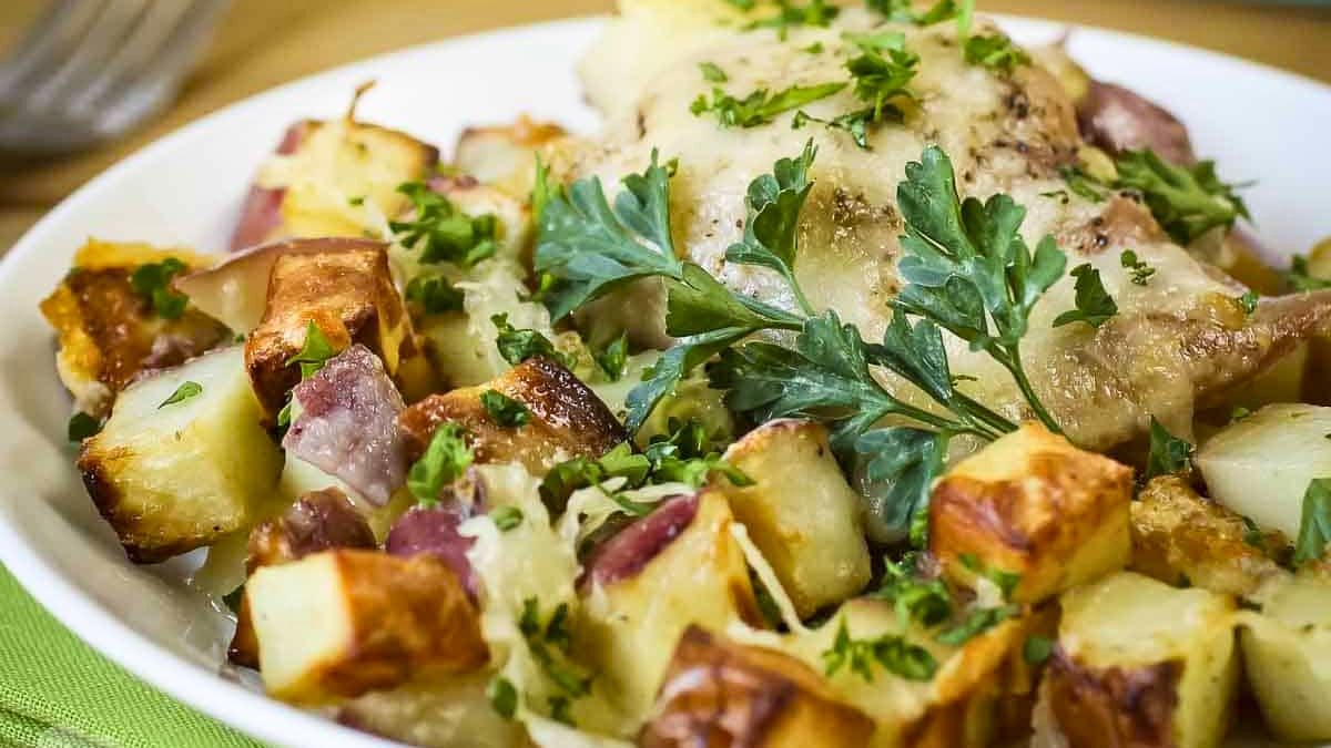 This chicken potato bake cooks everything together until the potatoes turn tender. Garlic and olive oil coat the pan so nothing dries out. Cheese melts over the top and stretches nicely when scooped. It works especially well when serving a crowd.