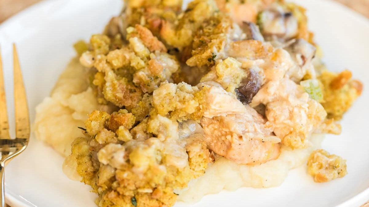 Chicken and Stuffing Casserole layers chicken with seasoned stuffing and a creamy sauce. As it bakes, the stuffing absorbs moisture and firms up. Therefore, each portion stays intact on the plate. It is a straightforward dinner option for cooler nights.
