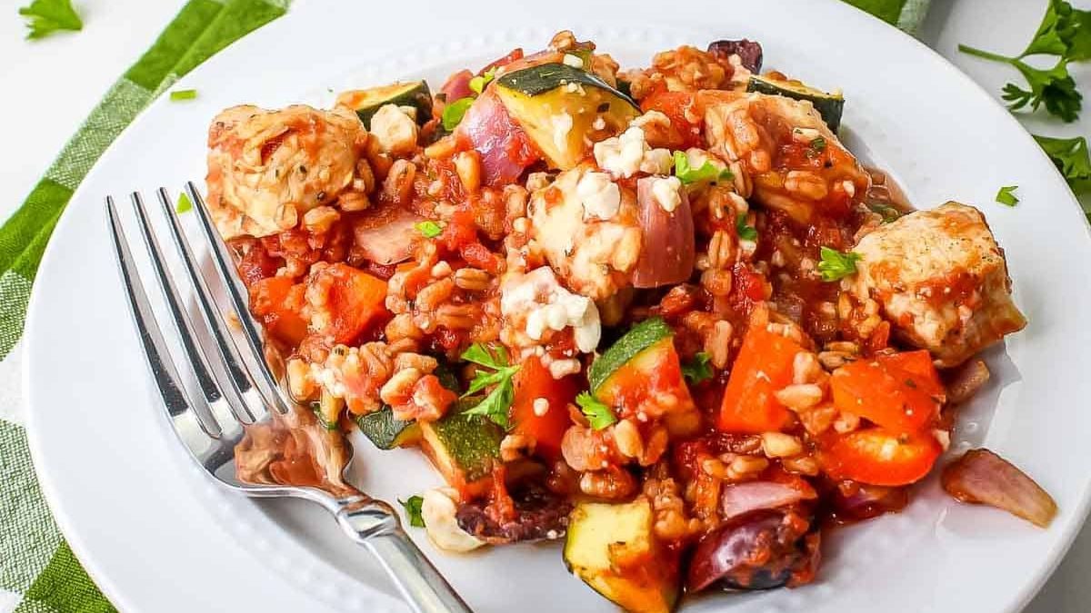 This chicken casserole bakes farro right in the dish, which saves time. As it cooks, the grains soak up flavor without turning mushy. The chicken stays juicy the whole way through. Dinner lands on the table in under an hour.