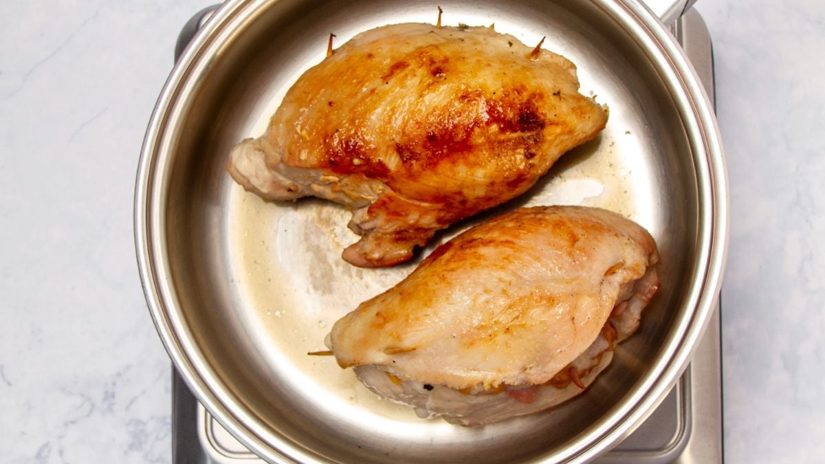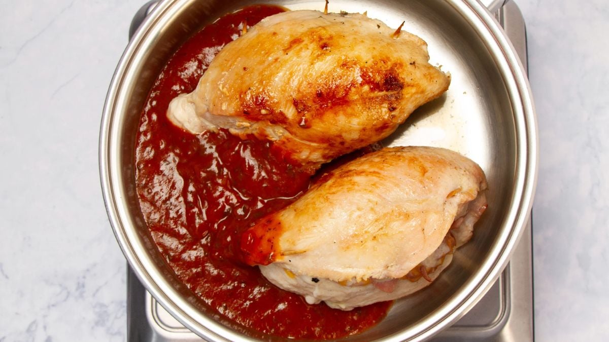 Pound the chicken cutlets thin and evenly so they roll easily without tearing, and keep the filling compact—adding a spoonful of Greek yogurt can help it hold together. Secure the rolls with water-soaked wooden toothpicks inserted diagonally for a better grip, and avoid over-browning to prevent the filling from leaking. Use a no-sugar marinara for the sauce, boosting flavor with a splash of white wine and fresh herbs if desired. Once sauced, lower the heat, cover, and cook just until done to keep the chicken tender and juicy.