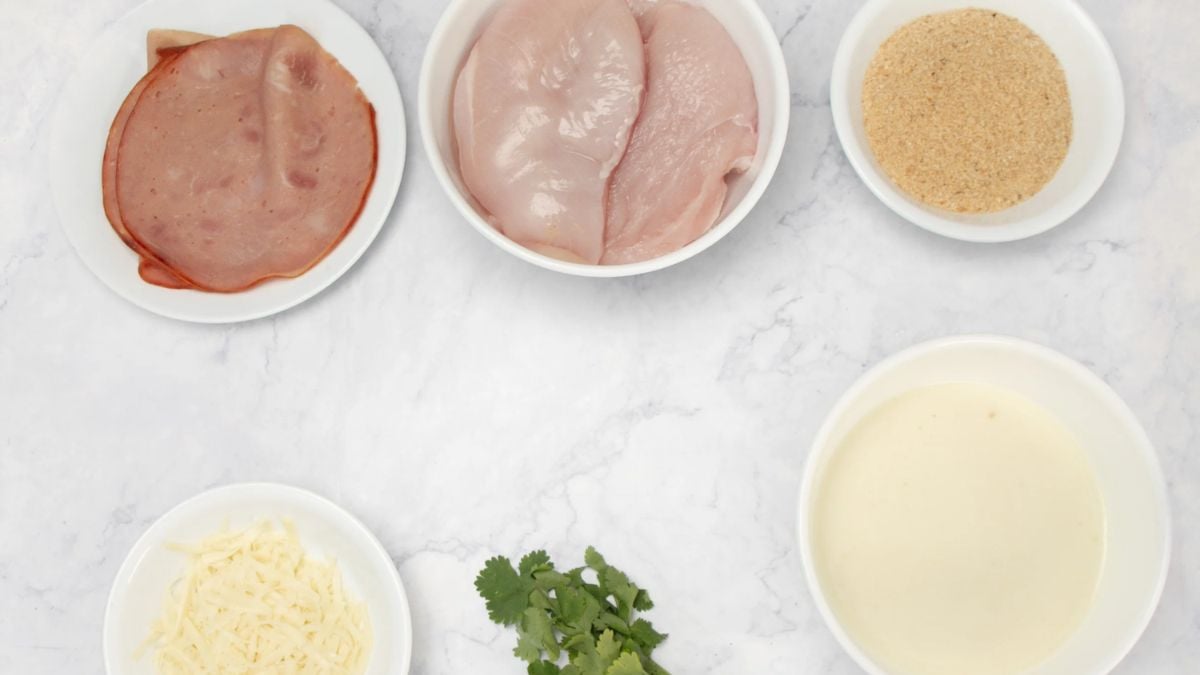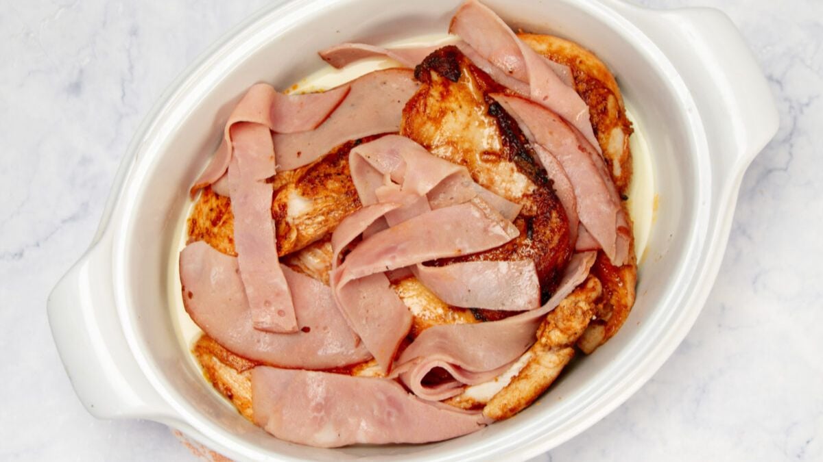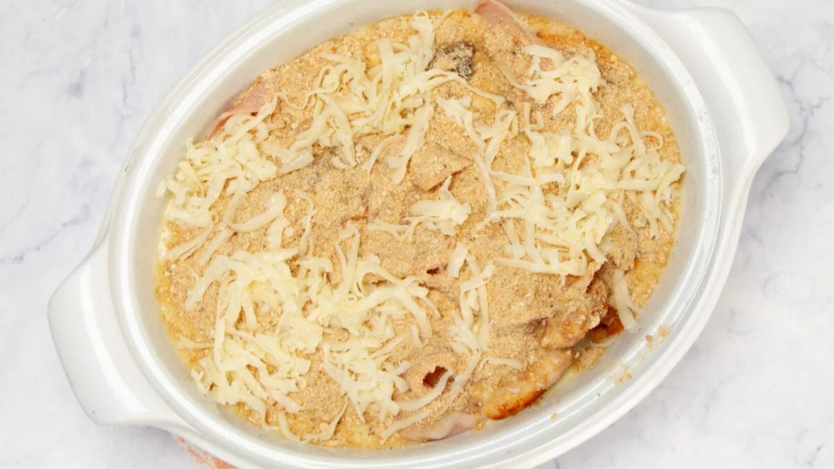 Preheat the oven to 375°F (190°C). Spread about two-thirds of the cream mixture in the bottom of a baking dish. Arrange the seared chicken on top, layer with the turkey ham, then pour over the remaining sauce. Sprinkle with the rest of the mozzarella and finish with an even layer of breadcrumbs.