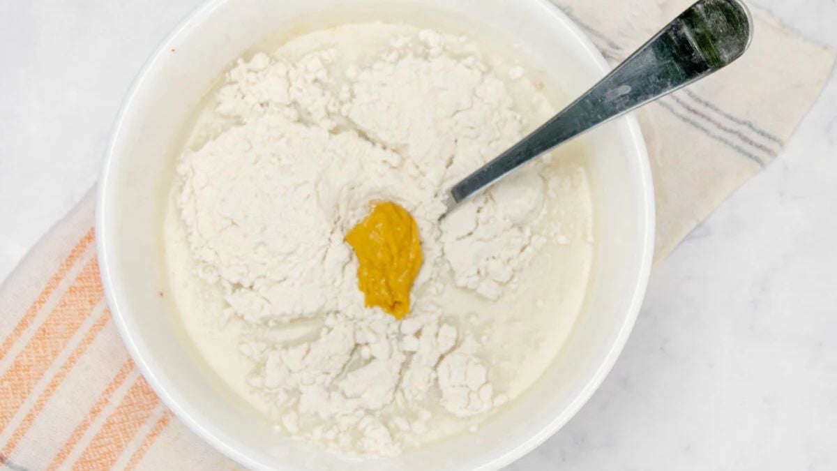 Season the chicken cutlets with salt, pepper, and paprika, rubbing the spices in well. Let the chicken rest for about 30 minutes while you whisk together the milk, mustard, flour, and half of the shredded mozzarella until smooth and lump-free.