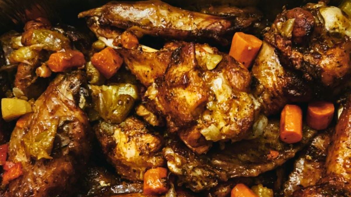 Seasoned turkey wings roast over a bed of carrots, onions, and celery until everything turns tender. The meat cooks up juicy and falls right off the bone. It’s a hearty meal that doesn’t need much else on the side.