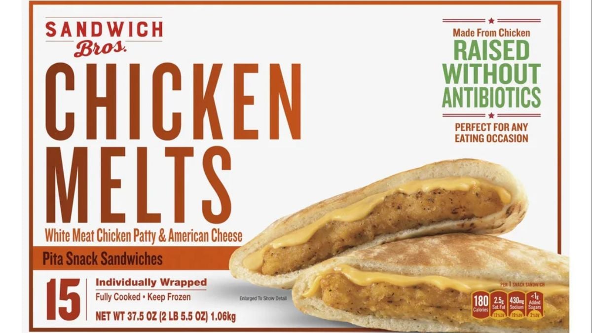Sandwich Bros Chicken Melts Pita Sandwiches hold breaded chicken and melted cheese in a ready-to-microwave pita. At under $1 per sandwich, they’re convenient, filling, and perfect for work lunches or quick meals.
