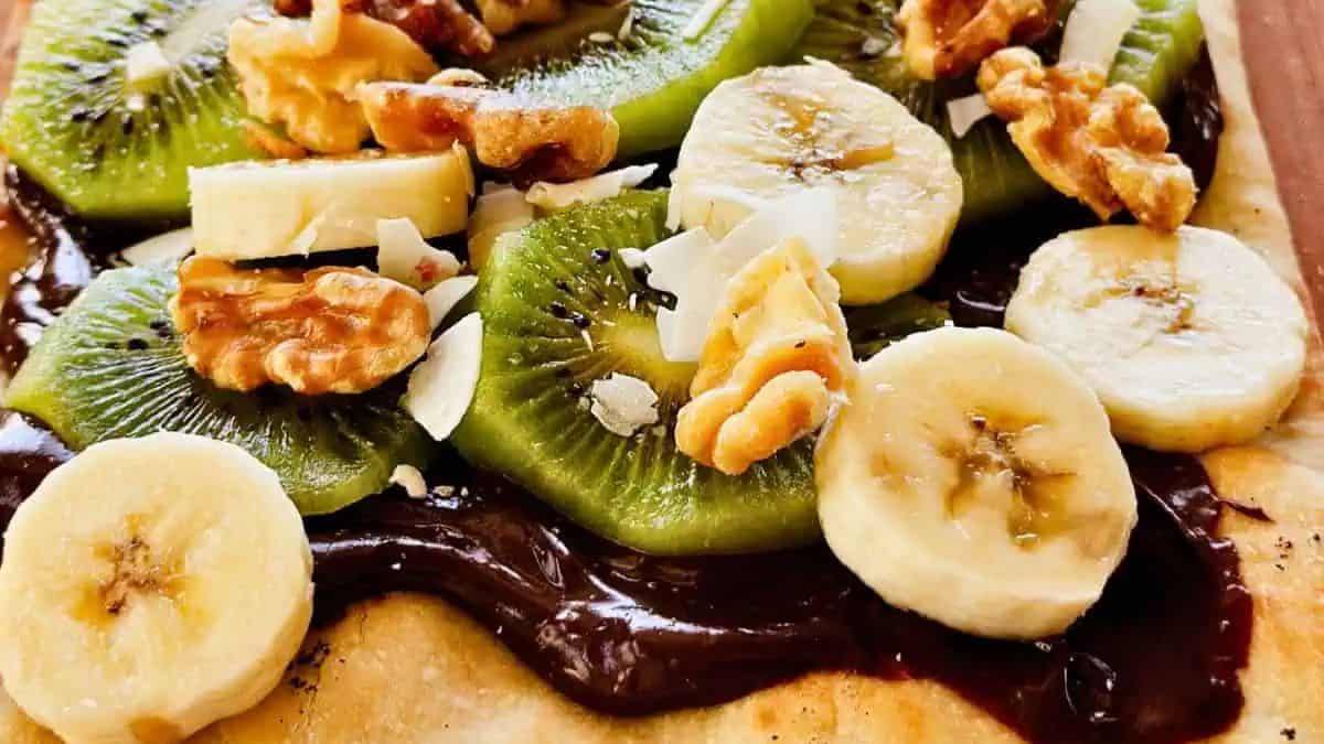 This dessert pizza starts with flatbread, then piles on chocolate spread, sliced fruit, and a sprinkle of nuts. The mix of banana and kiwi keeps it bright and fresh without being heavy. It comes together fast and slices easily for sharing. A fun pick when you want dessert that leans more fruity than rich.