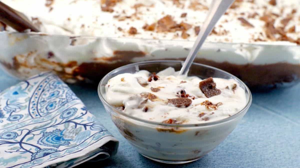 This chilled treat layers pudding, whipped topping, and Skor bits for a mix of creamy and crunchy. It’s ready in minutes and skips the oven completely, which is always a win. The candy pieces melt slightly into the layers, giving it a sweet caramel flavor throughout. Great for when you need dessert done fast without losing that homemade feel.