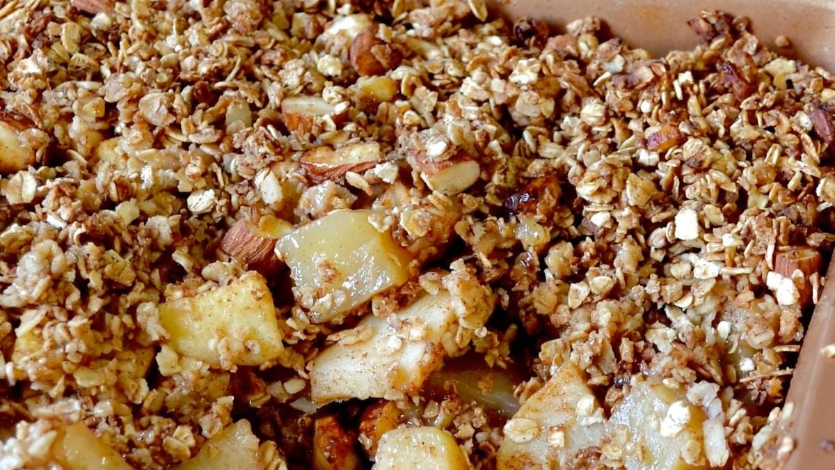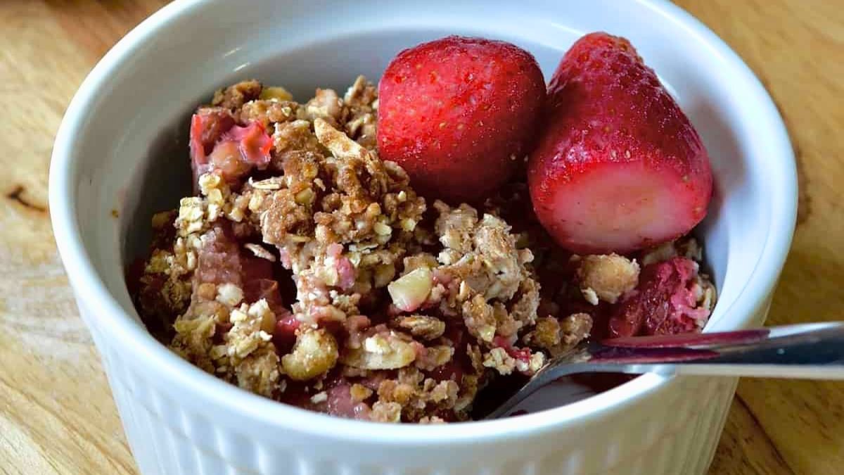 Sweet strawberries and tart rhubarb balance each other in every bite. The oat topping turns golden and crunchy while the fruit bakes down soft. A touch of vanilla and cocoa adds something extra. Serve it warm with a spoonful of yogurt or light ice cream if you like.