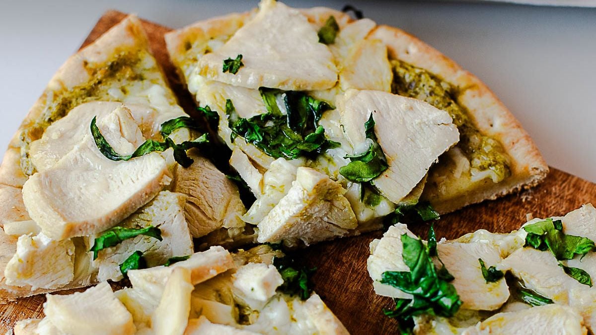 Chicken Pesto Flatbread layers pita, pesto yogurt sauce, mozzarella, spinach, and leftover chicken. It bakes in only 15 minutes and requires very little prep. This dish is filling without taking over the kitchen. It’s an easy choice for dinners that take 5 minutes prep time.