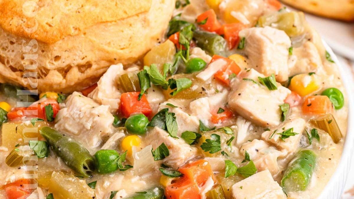 Creamy chicken, tender potatoes, and veggies all simmer until rich and hearty. Top it with golden biscuits and you’ve got the slow cooker version of a classic comfort meal. It’s cozy, filling, and easy to stretch into leftovers.