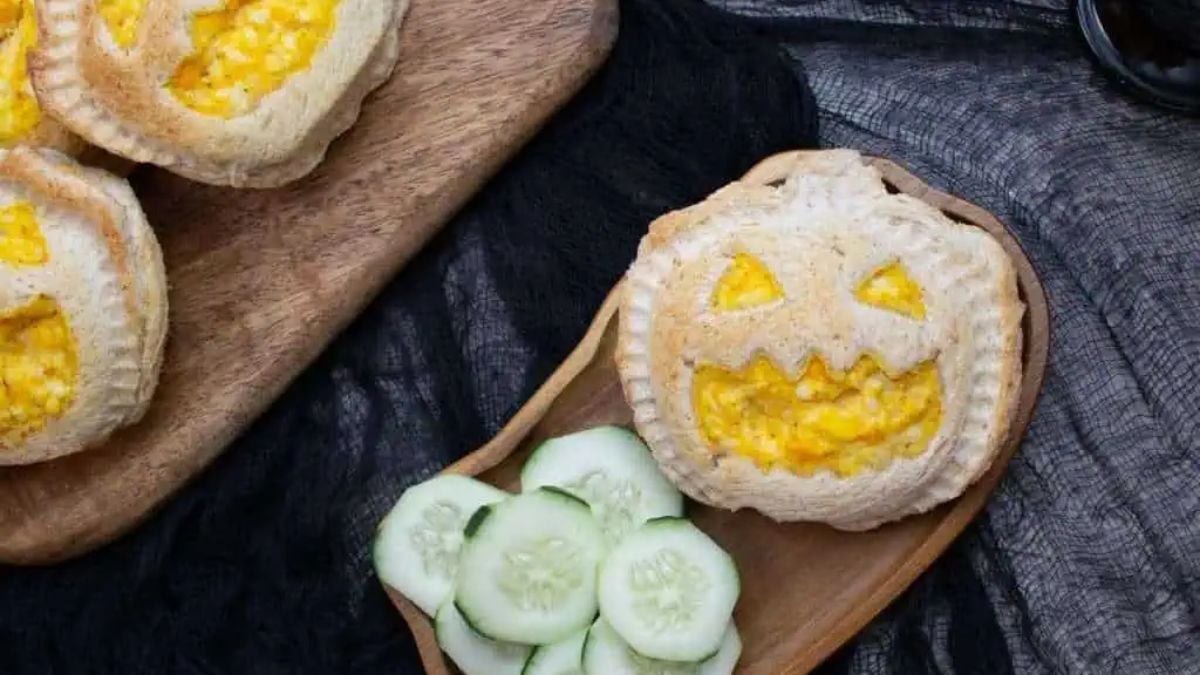These sandwiches pull double duty as a snack and a fun Halloween centerpiece. The mix of egg and pumpkin adds flavor and color, while a splash of brine gives it a tangy bite. Use cookie cutters to shape them for extra flair. They’re ideal for casual gatherings or classroom parties.