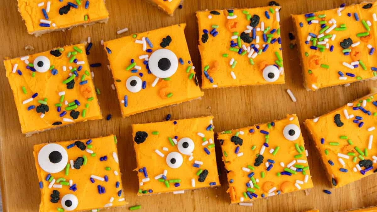 These bars come together fast and bake evenly for soft, chewy results every time. The creamy orange frosting adds a pop of color, and the sprinkles give them that extra festive touch. They cut cleanly into neat squares, which helps when serving a group. This recipe easily joins the list of easy Halloween desserts for a crowd you’ll want on repeat.