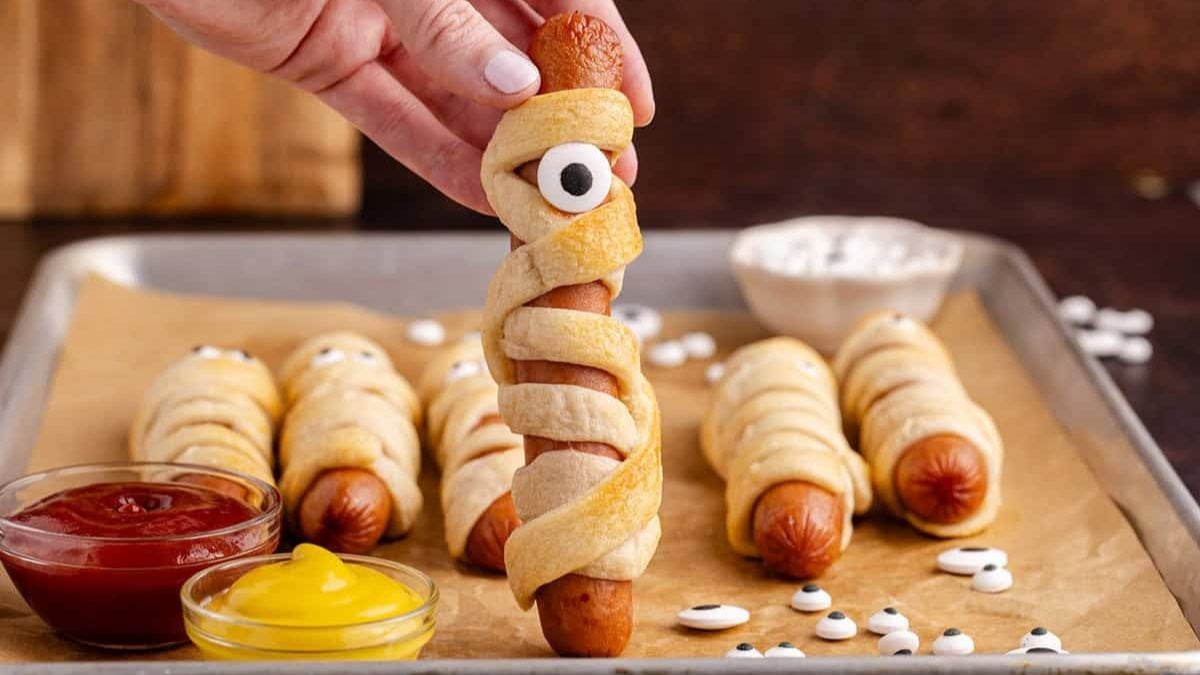 Buttery crescent dough wraps around hot dogs for a snack that’s equal parts cute and classic. They bake to a golden finish, and the candy eyes seal the deal on the Halloween theme. You can prep them ahead and warm them just before serving. They fit right in with easy Halloween desserts for a crowd, especially when paired with other themed snacks.