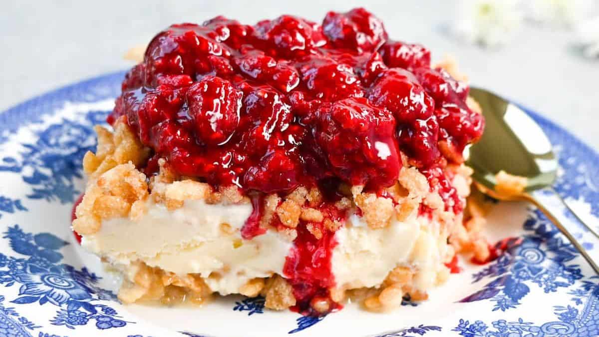 This frozen treat has layers of ice cream, raspberry, and cereal for a mix of textures that actually works. You build it in a dish, freeze it, then slice when you’re ready. It holds its shape outside for a bit, so it’s solid for parties. Make it ahead and forget about it until dessert time.
