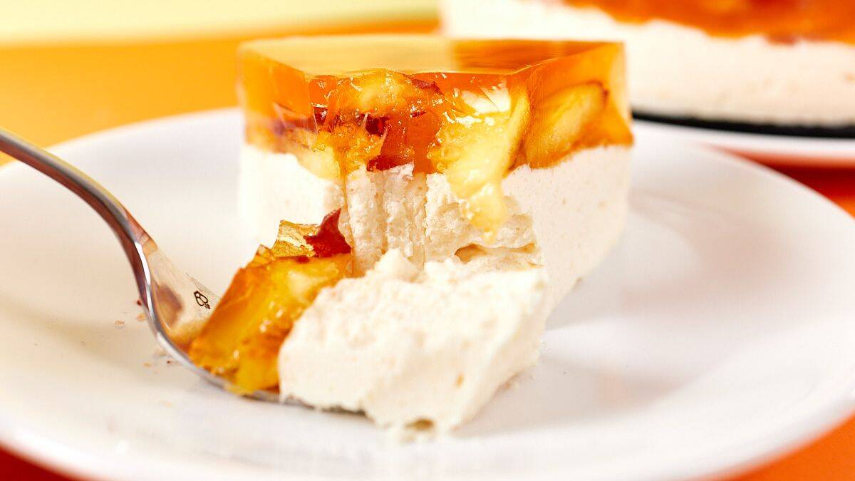 The almond sponge keeps things light while the yogurt layer adds creaminess without weighing it down. Fresh peaches bring in just the right amount of sweetness. A thin layer of orange jelly on top helps everything stay together. It’s a solid choice when you want something that looks like you put in effort without needing hours.