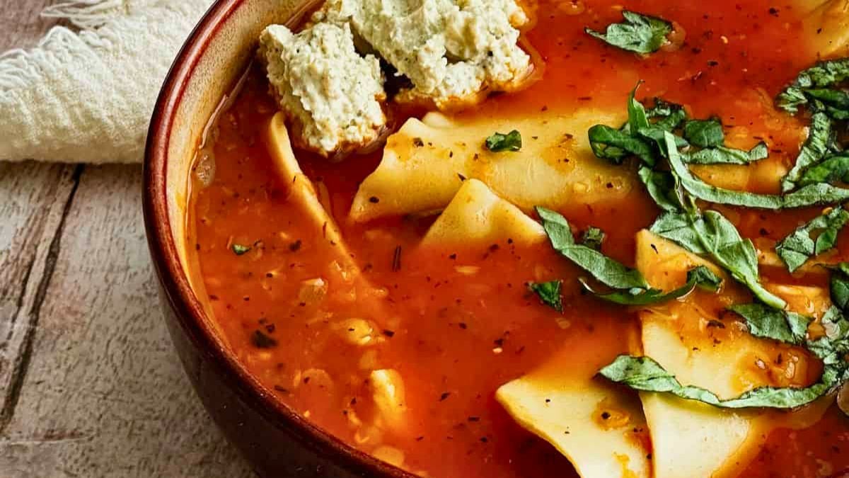 This vegan lasagna soup skips the layering but keeps the familiar flavors. The noodles, sauce, and protein cook together in one pot, which cuts down on prep time. It’s ready fast and fits neatly into busy evenings.