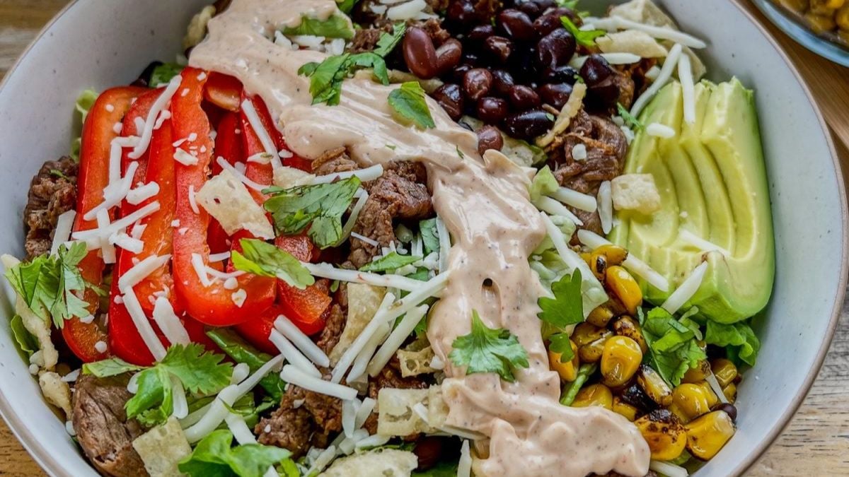 This Cobb Salad leans into bold flavors while still keeping things fresh. The grilled chicken, beans, and corn make it feel filling enough for a full meal. Then the chipotle lime dressing adds a bit of heat that wakes everything up. It’s a solid choice when you want something hearty but still packed with greens.