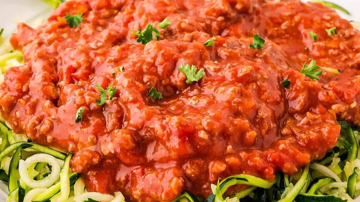 This bolognese simmers ground chicken with onions, carrots, celery, and tomatoes for a sauce that feels hearty but not heavy. A small splash of wine adds depth without overpowering the rest. Spoon it over pasta, rice, or veggie noodles, depending on the night.