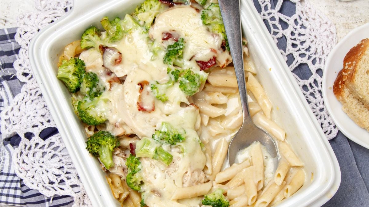 Whole wheat pasta, chicken, and broccoli get tossed in a creamy sauce that feels rich without being over the top. A little bacon on top gives it crunch and flavor in every bite. It’s warm, cheesy, and exactly what you want at the end of a long day.