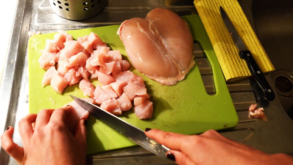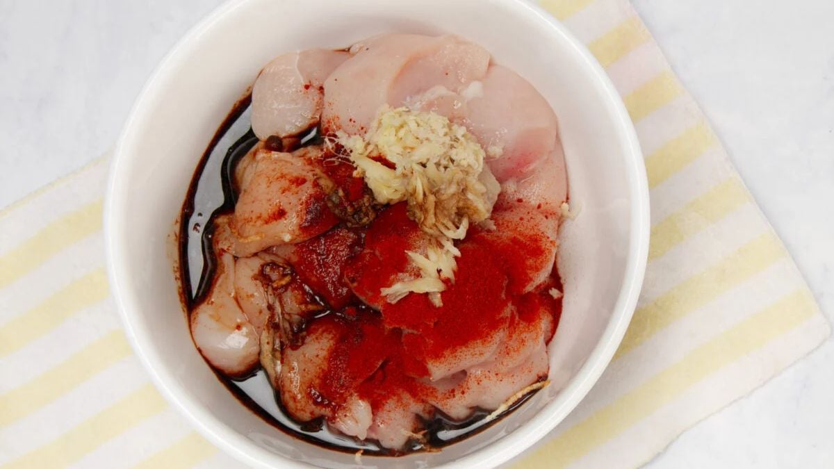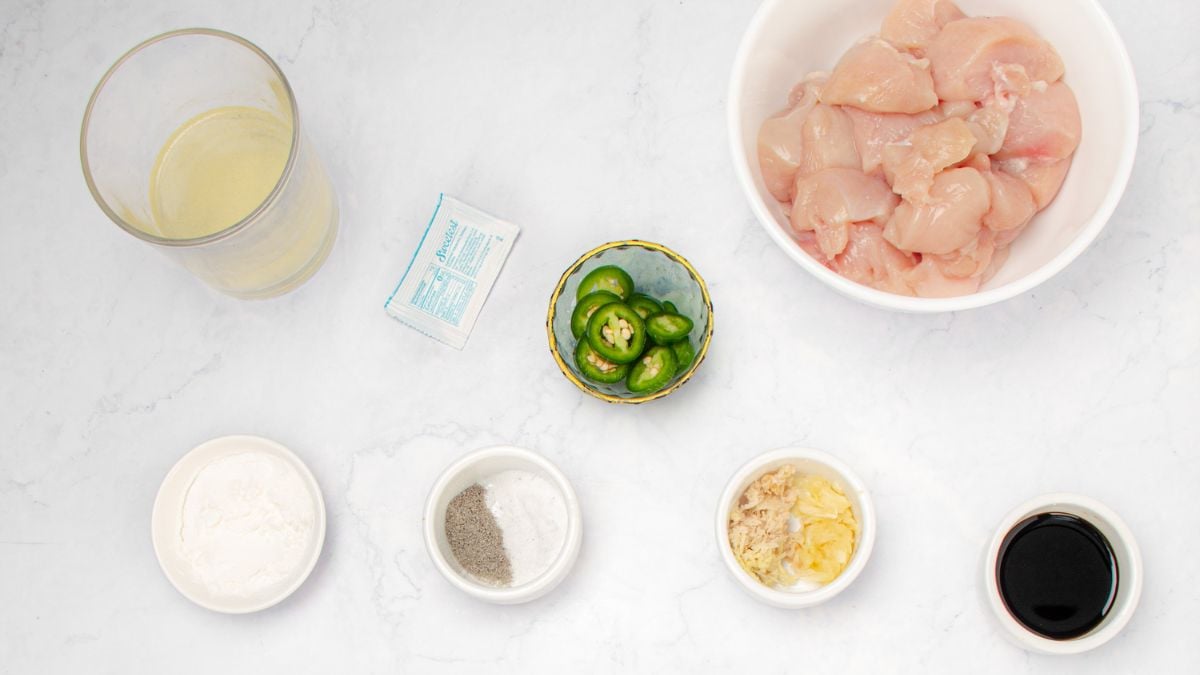 Place the cubed chicken in a bowl and add the soy sauce, garlic, ginger, and chili powder. Toss to coat evenly, cover, and let marinate for about 10 minutes while you prepare the remaining ingredients.