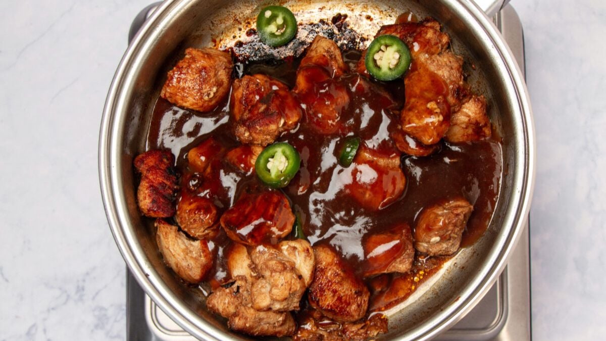 Cook the prepared sauce in a small saucepan over medium heat, stirring constantly for 3–5 minutes, until thick enough to coat the back of a spoon, adjusting with extra cornstarch slurry or broth if needed. Pour the sauce over the chicken, gently toss to coat evenly, and let the residual heat bring everything together before serving hot, topped with fresh jalapeño slices if desired.