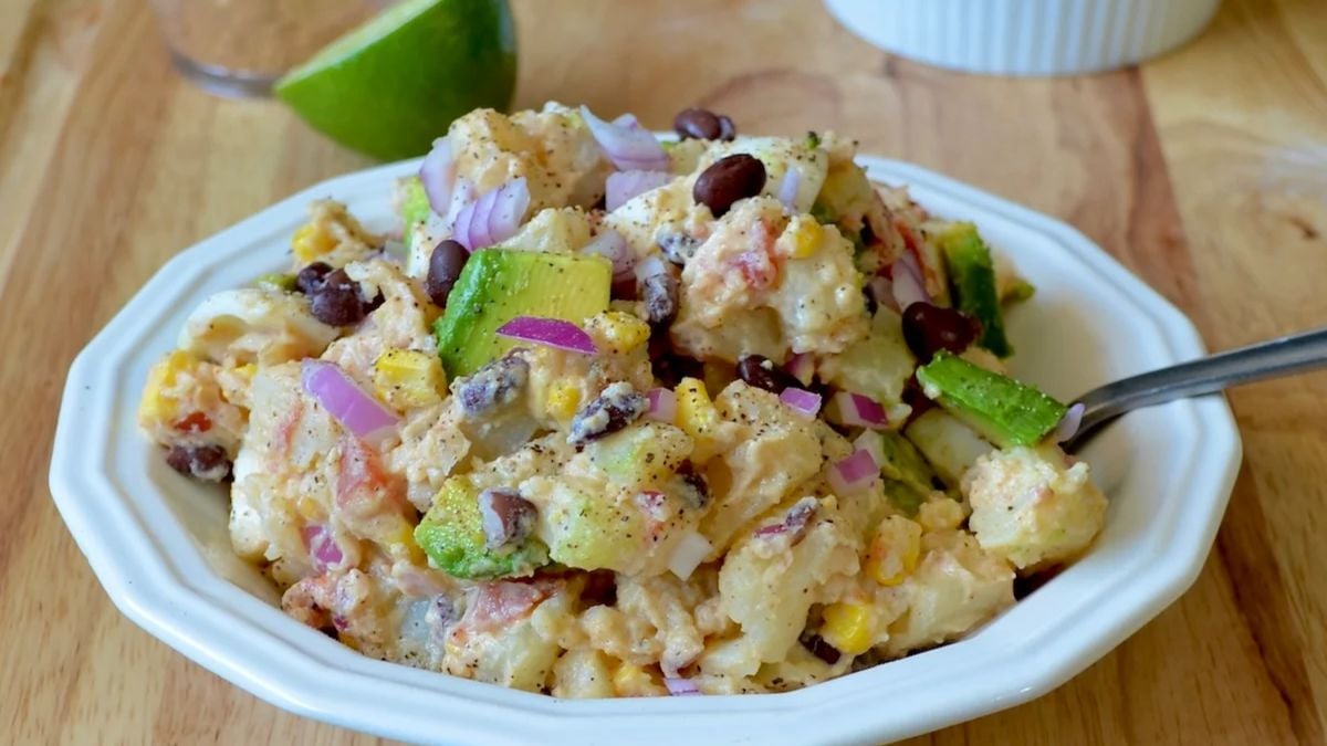 This Tex-Mex potato salad blends creamy avocado, taco seasoning, corn, and onion for a bold mix of flavors. The potatoes hold everything together while keeping the texture hearty. It’s a lighter version of a classic that’s still easy to bring to gatherings.