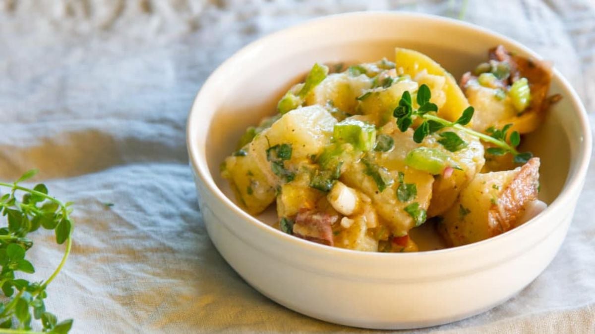 This potato salad skips mayo but still feels filling. Warm potatoes soak up a light dressing, which helps everything stay coated without feeling heavy. It holds well at room temperature. The bowl fits nicely into picnics or dinner spreads.
