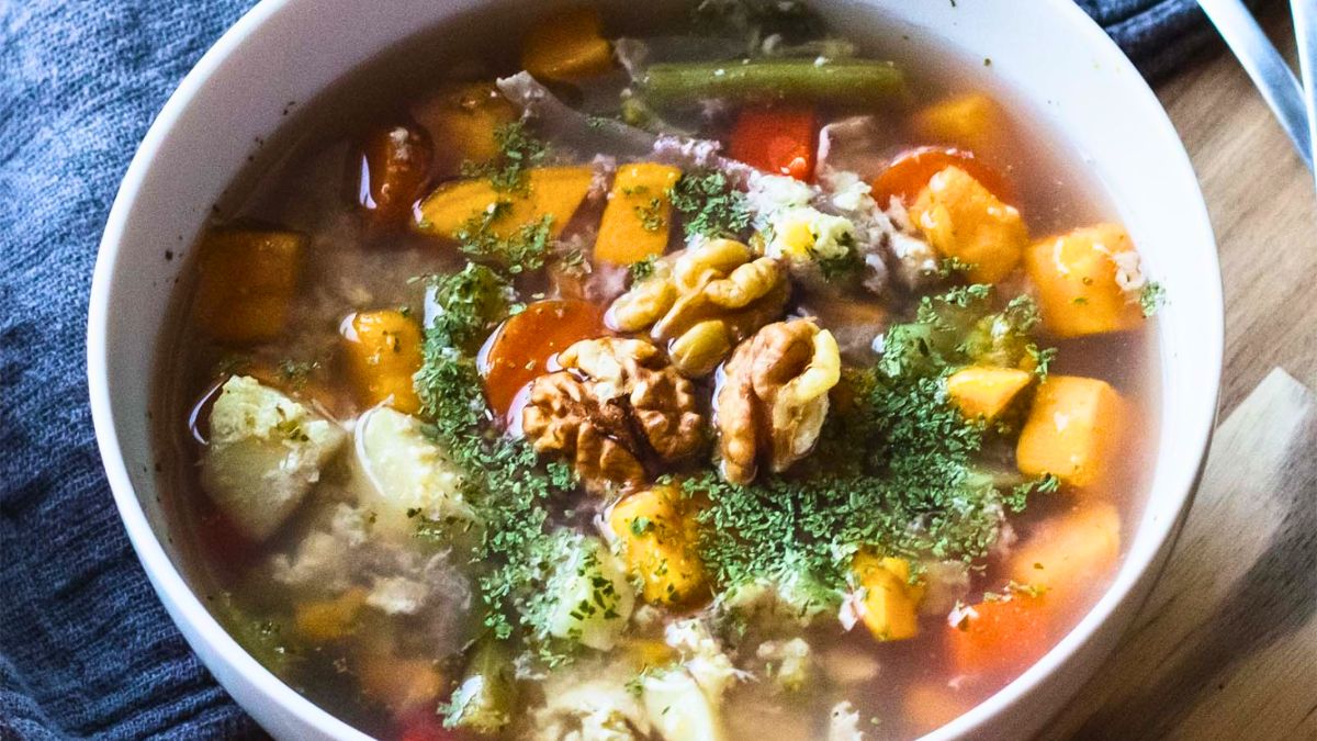 This chicken soup leans hearty without loading up on carbs. Butternut squash adds body, while the chicken keeps each serving filling. As temperatures drop, this soup fits right into regular rotation.