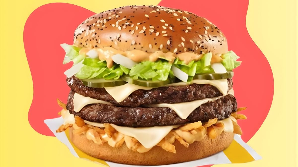 The Big Arch isn’t exactly shy about its size. The burger stacks two hefty patties with three slices of cheddar cheese for an extra-melty layer of flavor. It also includes lettuce, pickles, and two kinds of onions—crispy and slivered. Everything comes together on a toasted sesame and poppy seed bun. In short, it’s a towering fast-food burger designed to feel indulgent from the first bite.