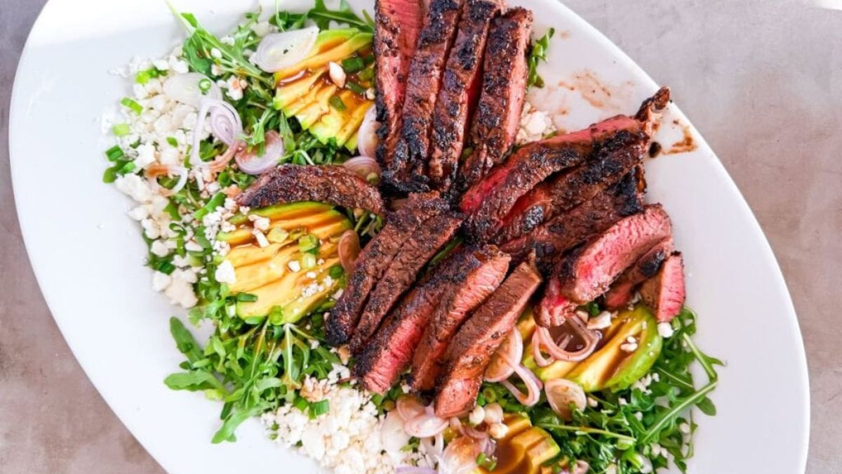 This arugula and steak salad eats like a full meal, not a side. Juicy slices of seared steak pair well with peppery greens, creamy avocado, and crumbled feta. Meanwhile, a drizzle of balsamic glaze adds just enough sweetness. It works well for dinner when heavy food sounds unappealing.