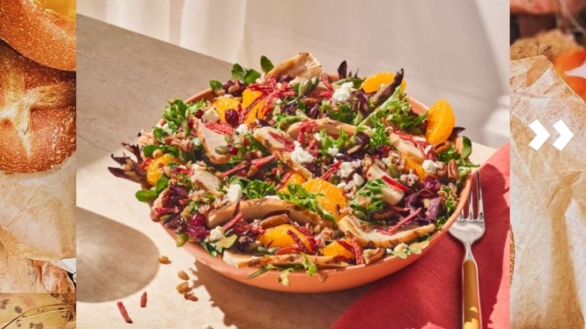 Soup may be the main event, but the new Harvest Medley Chicken Salad is quietly stealing attention. It’s a loaded mix of greens, whole grains, grilled chicken, mandarin oranges, feta, and crunchy toppings like pumpkin seeds and beet strips. Tossed in balsamic vinaigrette, it’s a fall salad that doesn’t feel boring.