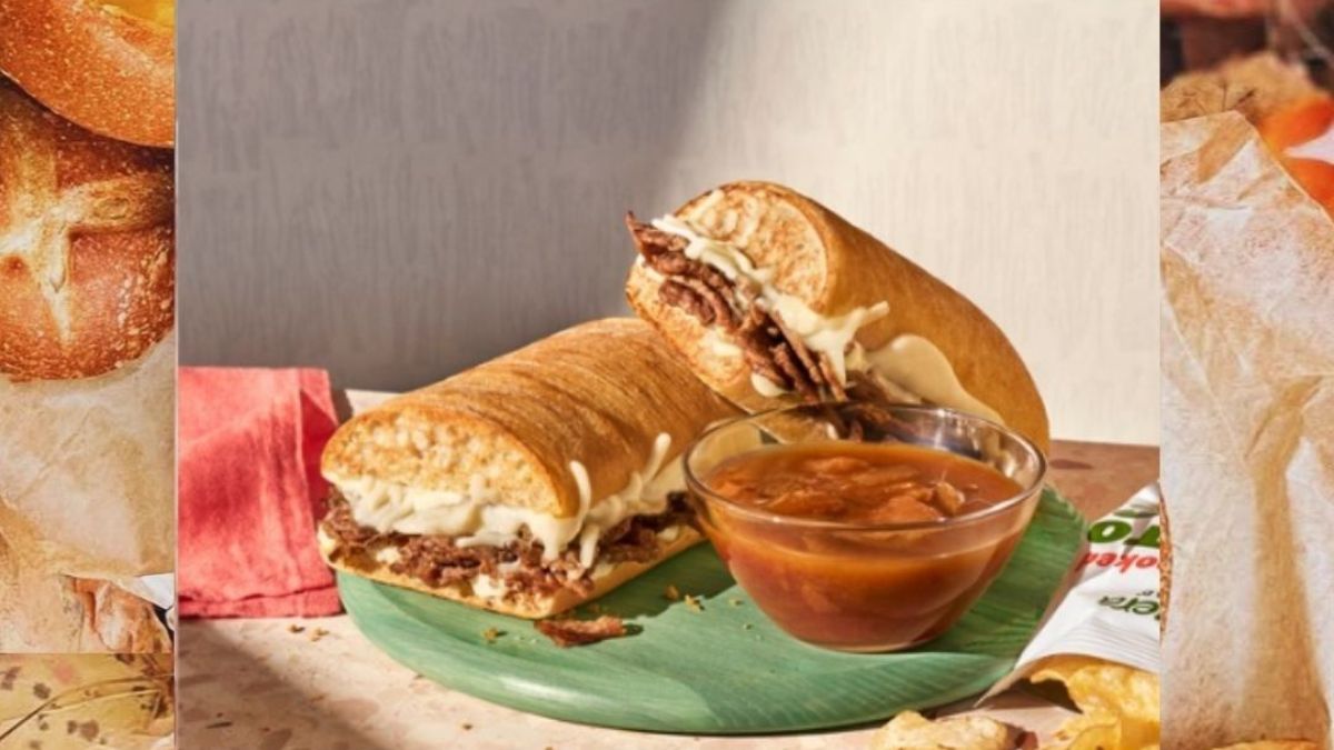 The French Dipper is a bold, beefy option featuring marinated steak, provolone, asiago, and garlic aioli on ciabatta bread. It comes with a side of Bistro French Onion Soup to dunk into — a combination designed for anyone craving full-on comfort food.