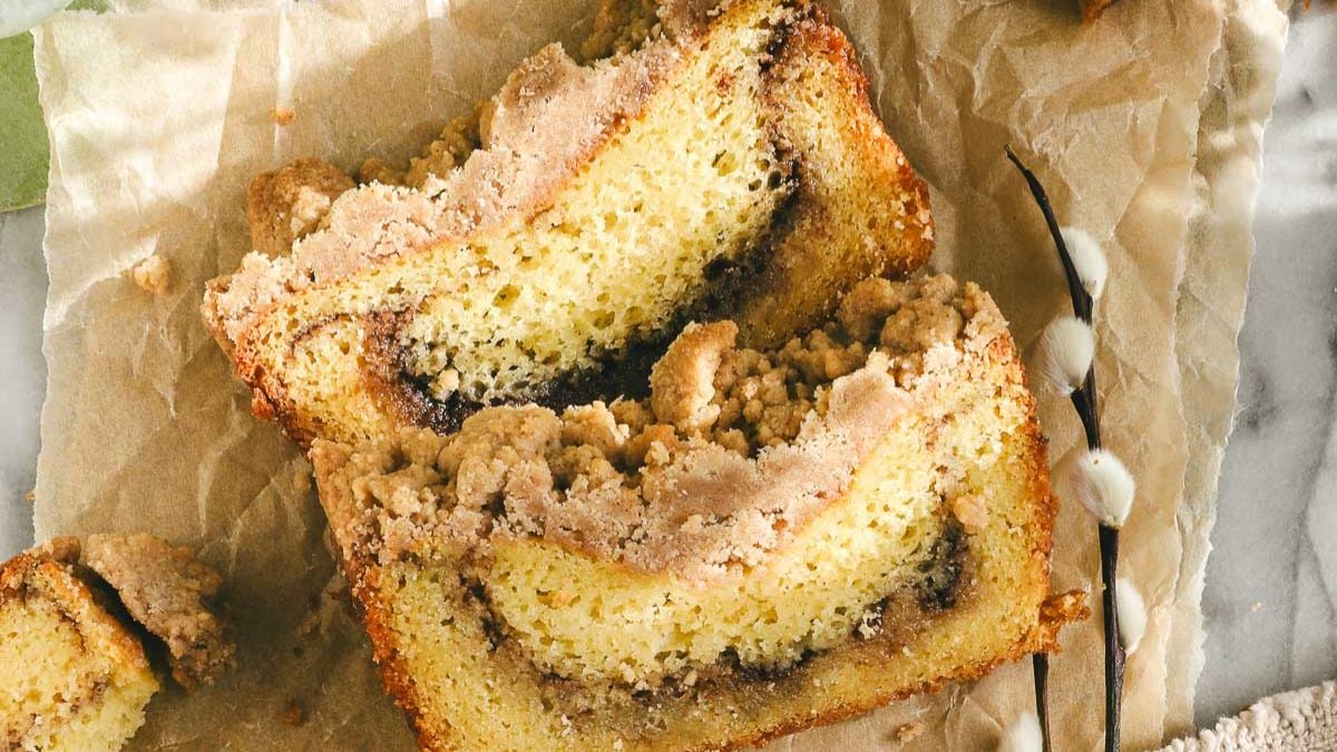 This loaf pan coffee cake skips the hassle of a large pan but still delivers big flavor. A cinnamon swirl runs through the center, while the crumb topping adds texture without falling off everywhere. After slicing, each piece keeps clean edges instead of crumbling apart.