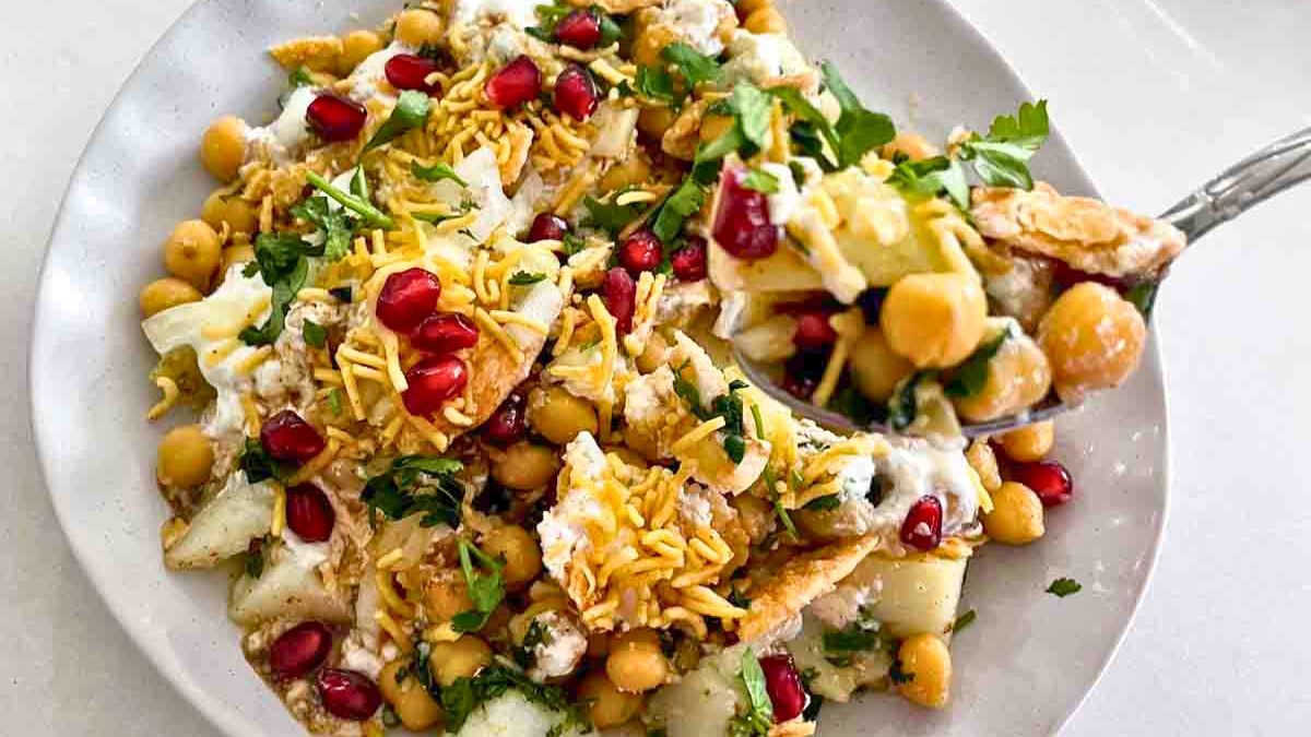 This potato and chickpea chaat comes together fast and keeps things lively. Soft potatoes balance the chickpeas, while the seasoning keeps each forkful bold. Fresh toppings add contrast without extra work. It works well as a snack or light meal.
