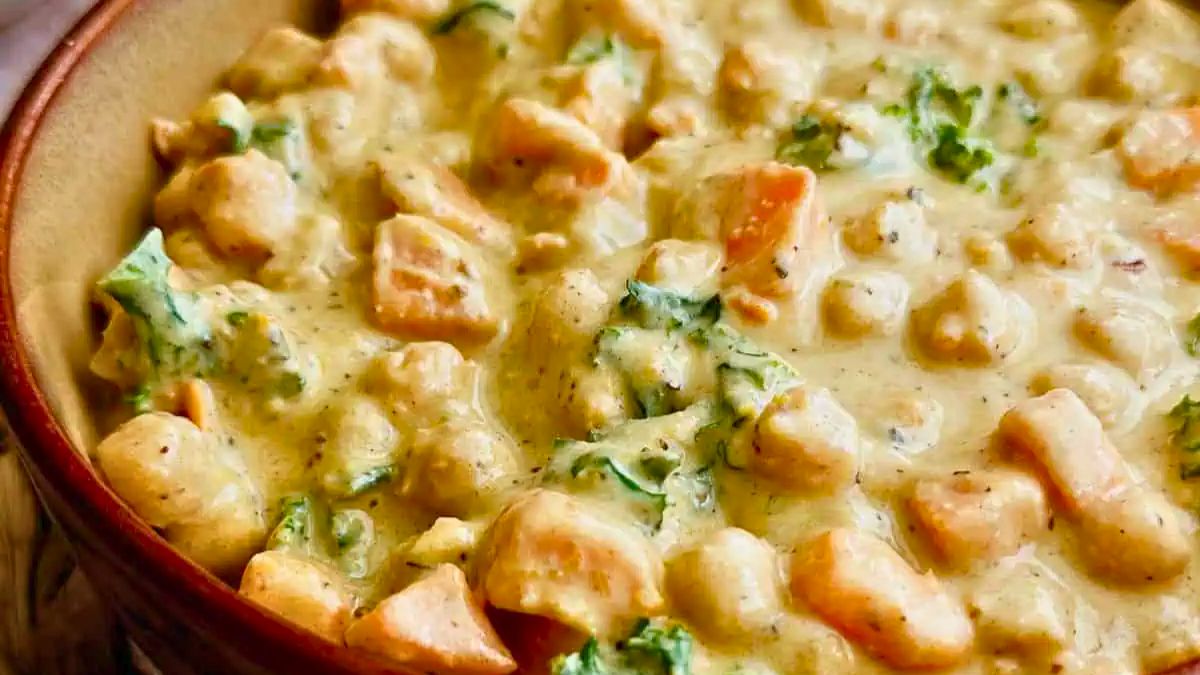 This creamy sweet potato and chickpea dish comes together without much effort. The sauce thickens fast, so dinner stays on schedule. Each bite balances soft veggies with hearty chickpeas. Leftovers reheat well the next day.
