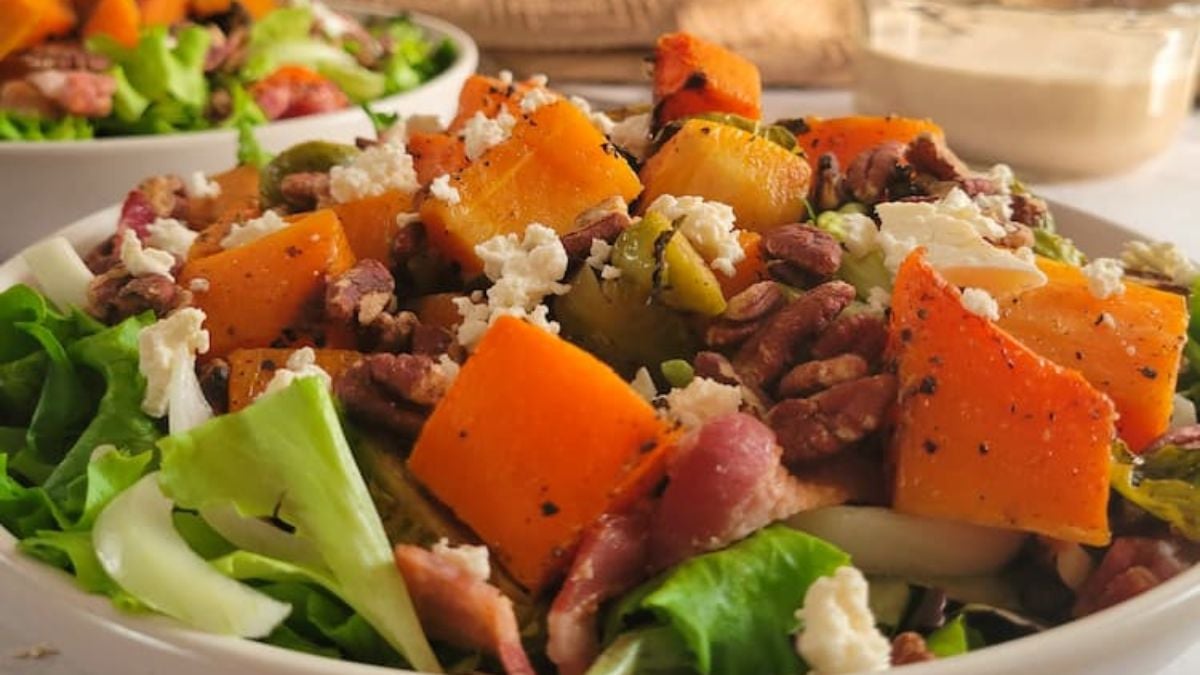 Roasted butternut squash, brussels sprouts, feta, and pecans give this salad a warm and cozy vibe. The mix of textures, from soft squash to crunchy nuts, keeps it interesting. A drizzle of simple vinaigrette pulls everything together. It’s a smart pick for anyone wanting fall flavor without going overboard.