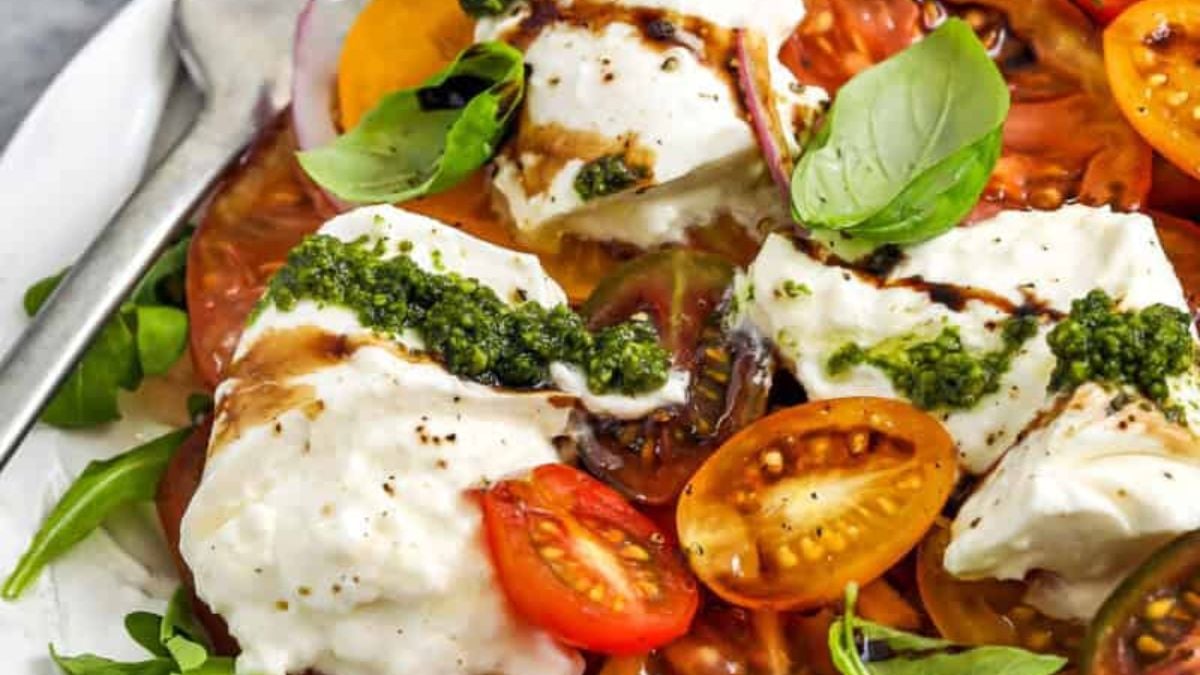 This tomato burrata salad is simple but feels special every time. The creamy burrata melts into juicy tomatoes and crisp arugula for that perfect balance of rich and fresh. A drizzle of olive oil and a swipe of pesto bring everything together without overdoing it. It’s the kind of salad that turns a basic meal into something worth bragging about.