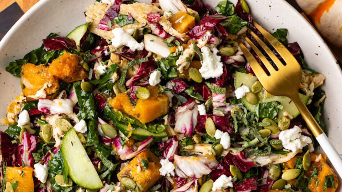 This radicchio and kale salad layers textures without feeling complicated. Meanwhile, roasted squash and chicken add contrast to the greens. Since the dressing coats evenly, each serving stays consistent. It works well as a full meal or shared side.