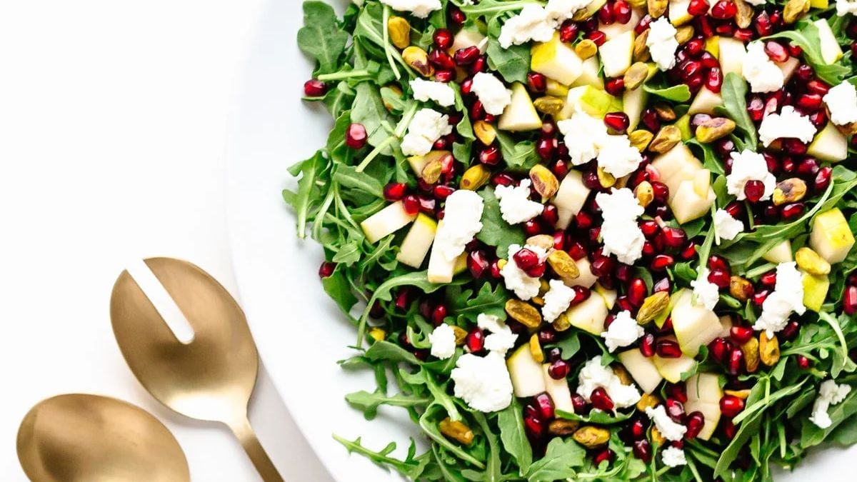 This winter holiday salad mixes greens with fruit, nuts, and cheese in a smart way. Pears and pomegranate add contrast, while pistachios bring crunch. Then the vinaigrette coats lightly without weighing anything down. It fits holidays and weeknights alike.