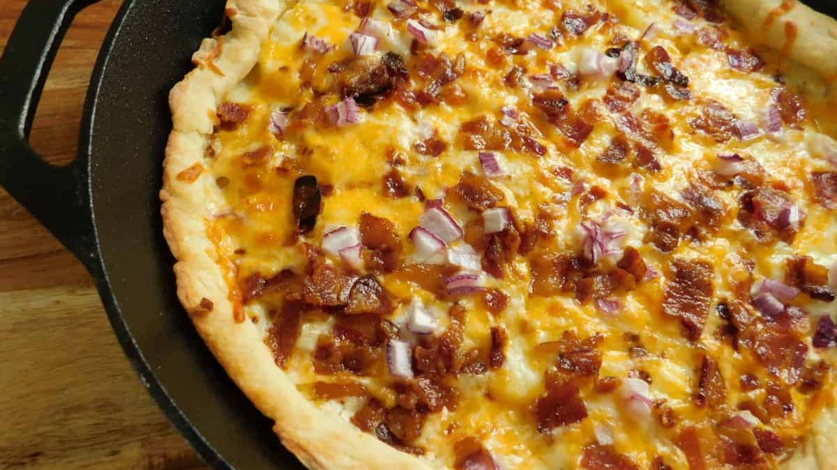 Loaded potato pizza cooks fully in the skillet without much effort. While the crust firms up, the potatoes and toppings heat evenly. As a result, each slice holds together when served. This dish shows how skillet family meals can feel a little more fun.