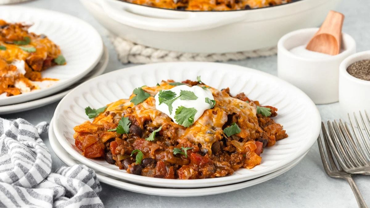 This beef enchilada skillet cooks in one pan for a fast dinner fix. Ground beef, cheese, and enchilada spices come together with minimal effort. It’s hearty enough for family dinners and cleanup is simple.