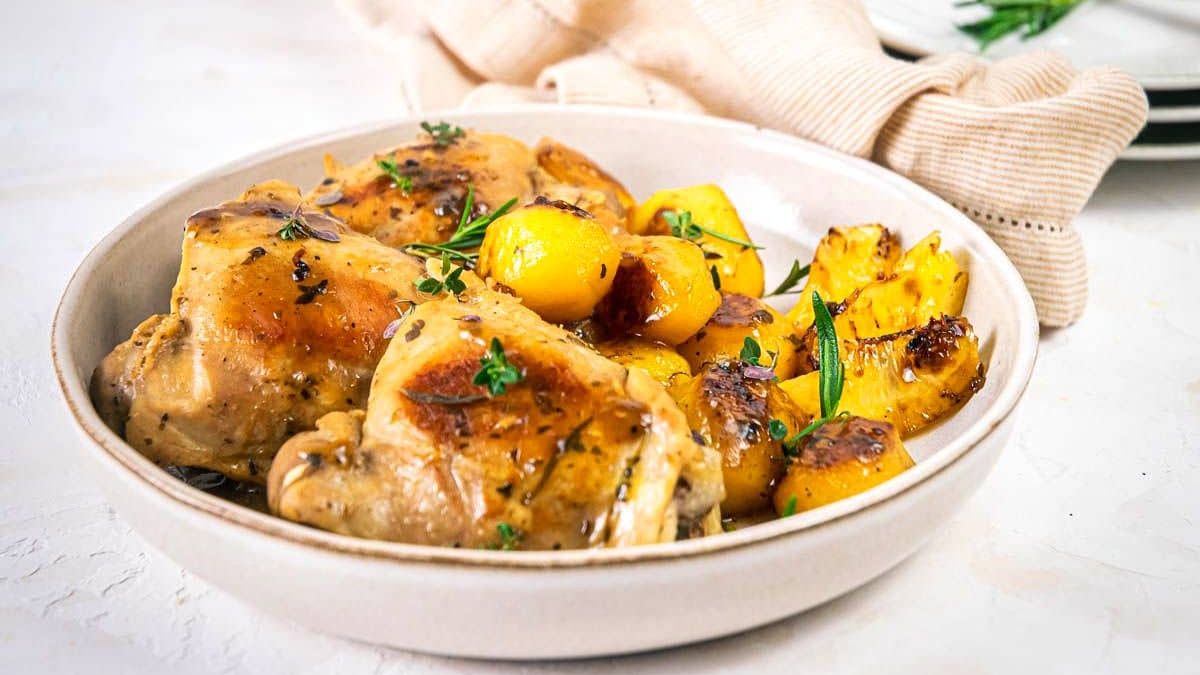 This skillet Greek lemon chicken cooks thighs and baby potatoes together for a fast, flavorful meal. The chicken stays juicy while the potatoes soak up the herb and lemon broth. Minimal prep makes it great for busy nights.