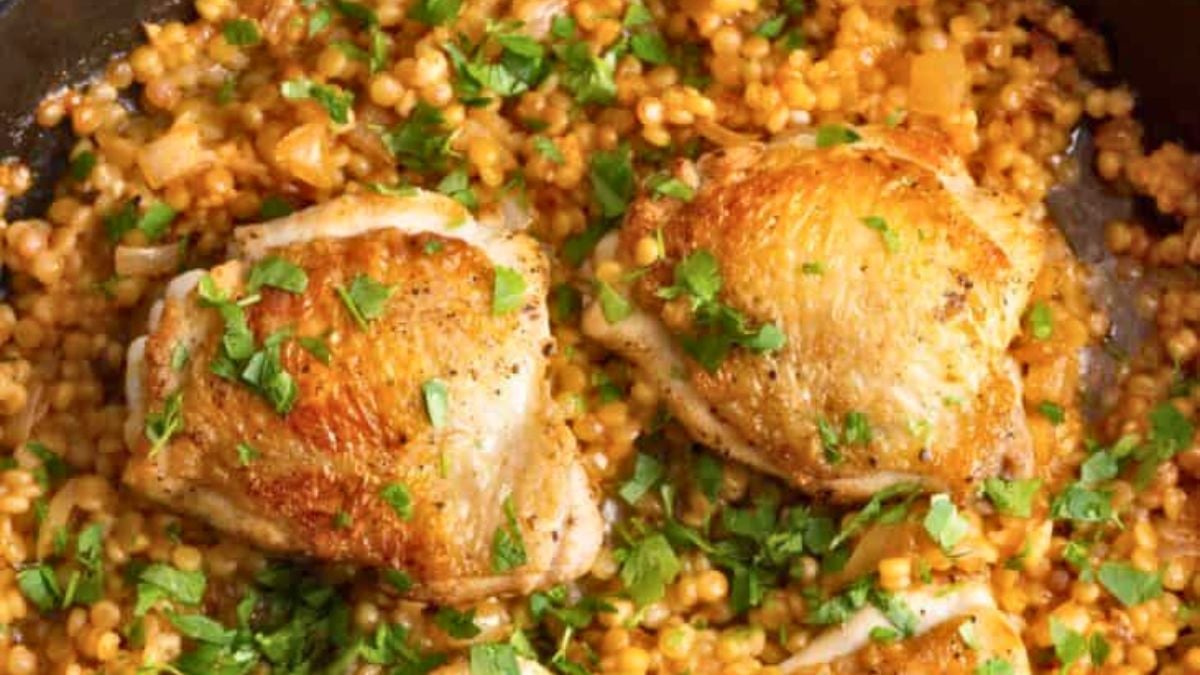 One Pan Chicken and Couscous finishes in about thirty minutes. The couscous absorbs liquid while the chicken stays juicy. As a result, the dish holds together well. Cleanup stays minimal after dinner.